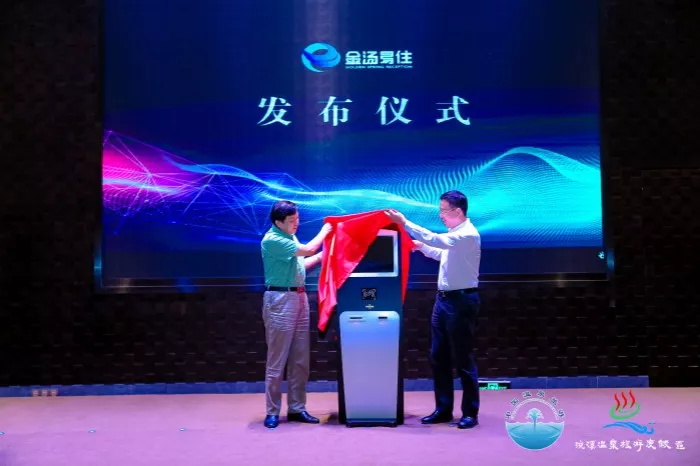 中國(guó)旅游協(xié)會(huì)溫泉旅游分會(huì)會(huì)長(zhǎng)黃志敏、秘書長(zhǎng)張?jiān)焦餐瑸榈谝慌_(tái)金湯易住揭幕。