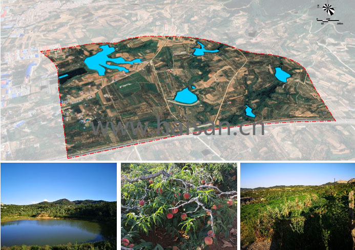 基地地形屬低山丘陵,形成了四丘三谷狀地形特征。谷盆中分布著五個(gè)大小不一的水庫(kù),連接多條縱向溝壑,有較高起伏。植被多原始生態(tài),以果林(桃樹(shù))為主,整體生態(tài)環(huán)境較好,視野開(kāi)闊而局部幽隱。